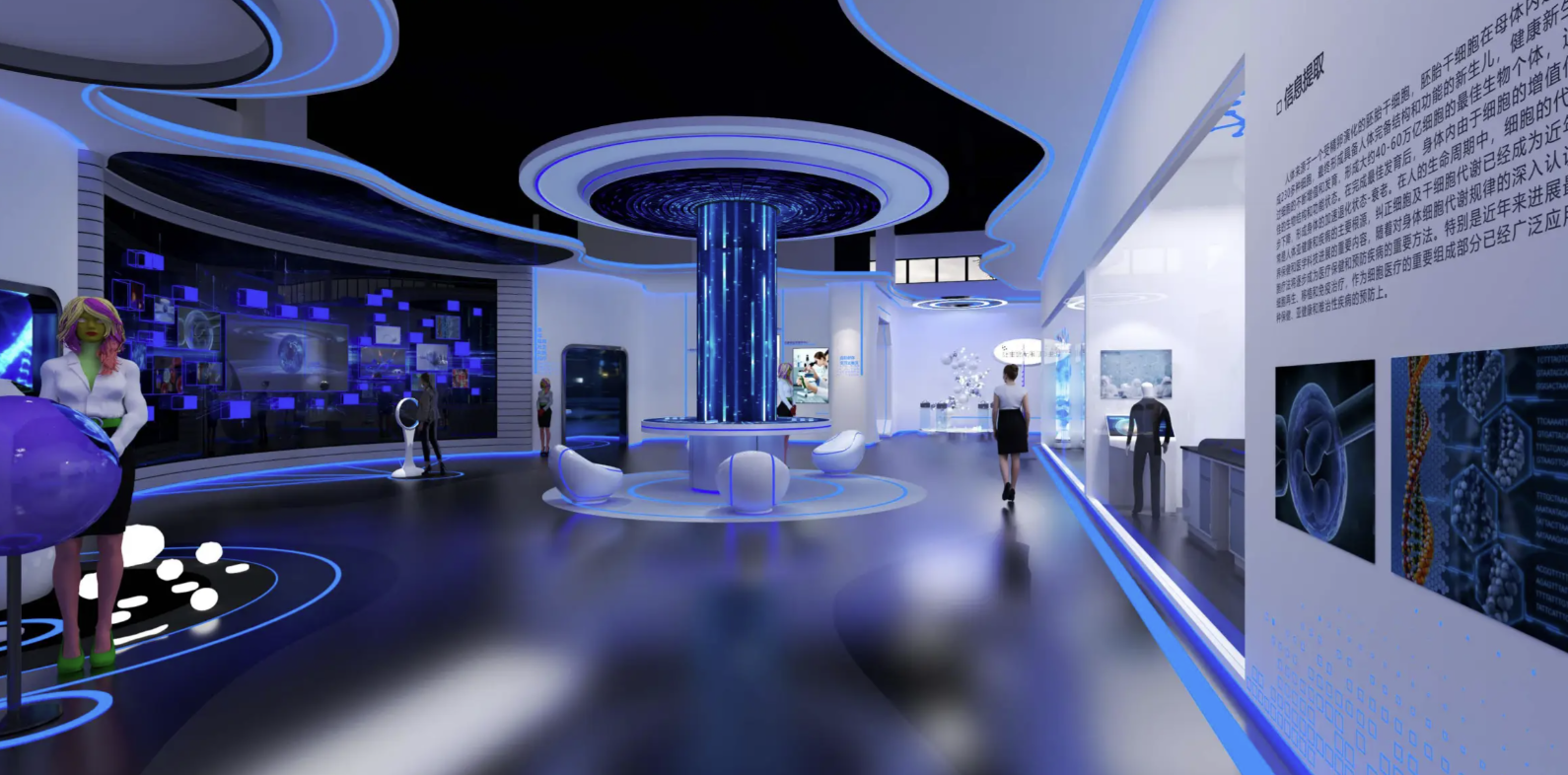 思威图数字的设计团队深谙干细胞研究的特殊性,在空间叙事中植入 "生命解码" 的概念。通过环形动线与模块化展区的精密计算,形成符合细胞研究逻辑的参观流线。高度定制化的展墙系统,既能承载复杂的基因图谱展示,又为动态数字内容提供完美的呈现载体,实现科学数据的可视化蜕变。
