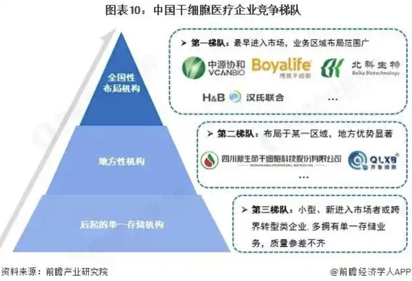 根据企业业务覆盖范围的差异,可将中国干细胞医疗企业分为三个梯队。位列第一梯队的中源协和、博雅干细胞、北科生物、汉氏联合等具有品牌积累的老牌细胞存储机构先发优势显著,在干细胞市场上具有更强号召力;第二梯队的四川新生命干细胞和齐鲁细胞等干细胞企业重点布局于某一区域,地方的区域性业务优势显著;第三梯队则为小型、新进入市场者或跨界转型类企业,多拥有单一存储业务,质量参差不齐。