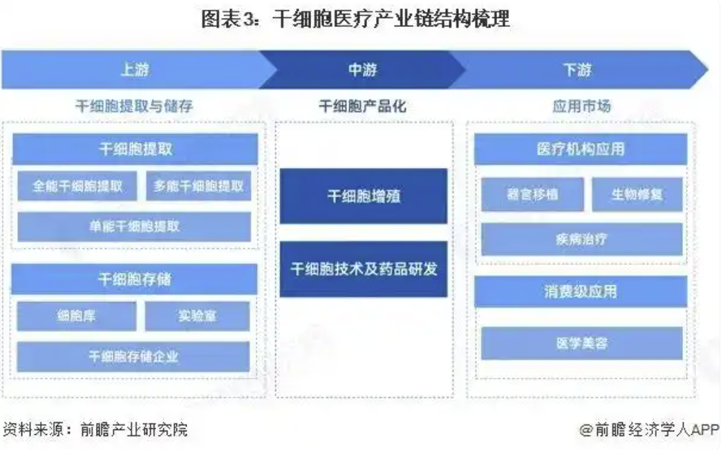 下游由开展干细胞医疗的机构组成,以体系三甲医院为主,目前,干细胞治疗可用于对组织细胞损伤修复、代替损伤细胞功能等领域的疾病治疗;用体外培养、扩增的干细胞培育人体组织器官进行器官移植以及对自身免疫性疾病进行生物修复。此外,在消费级应用领域,干细胞还能用于医学美容,延缓细胞衰老。