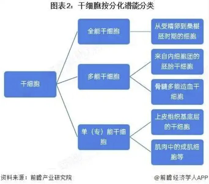 干细胞广泛存在于机体各组织器官中,如骨髓、外周血、早期胚胎以及成年组织中。按其分化潜能划分,一般将干细胞划分为三种:全能干细胞、多能干细胞与单能干细胞。