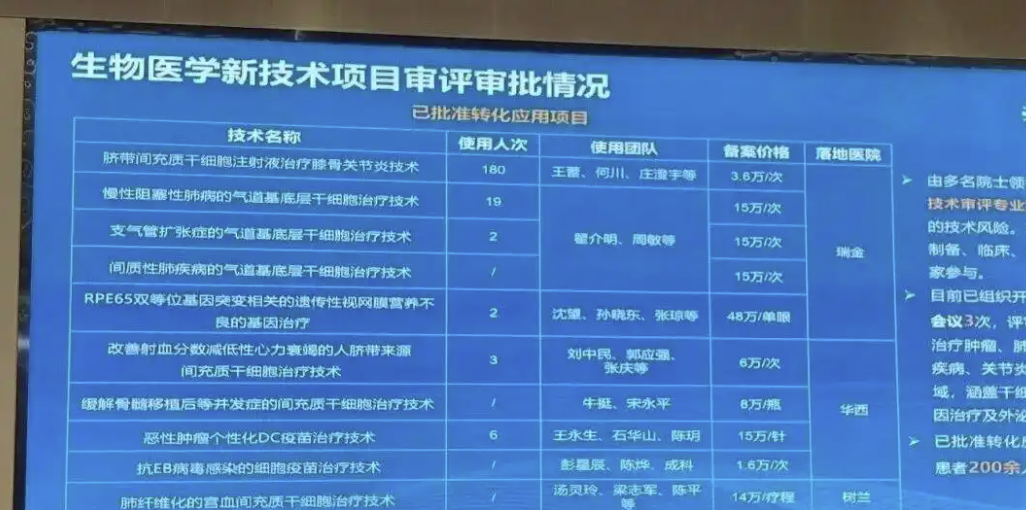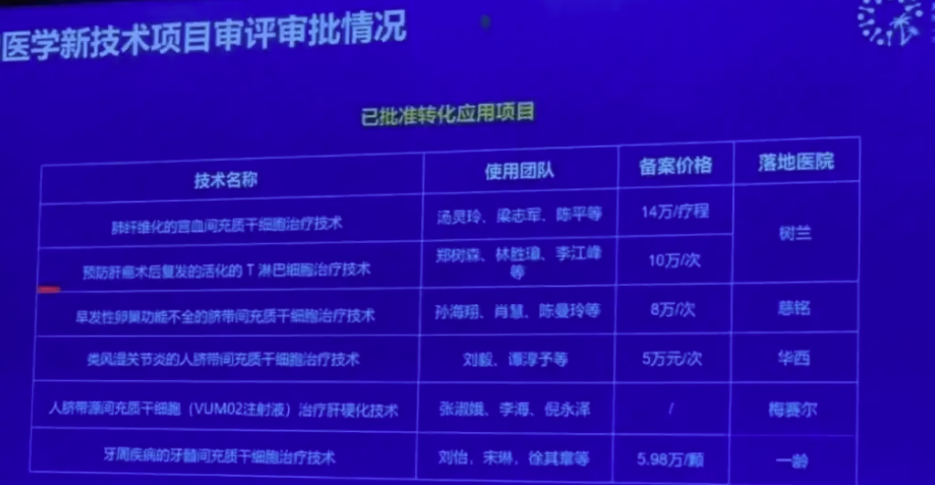 除此之外,2025年2月,海南省人大常委会正式公布的《海南自由贸易港博鳌乐城国际医疗旅游先行区生物医学新技术促进规定》正式执行,可透明收费。截至目前主要10个适应症,分别是膝骨关节炎(3.6万/次)、慢性阻塞性肺病治疗(15万/次)、心力衰竭干预治疗(6万/次)、恶性肿瘤(个性化DC疫苗治疗技术15 万/次,需6~7 次)、骨髓移植后抗宿主病(8万/次)、间质性肺疾病(15万/次)、支气管扩张症(15万/次)、RPE65双等位基因突变相关遗传性视网膜营养不良(48万/次)、抗EB病毒感染的细胞疫苗技术(1.6万/次) 、肺纤维化的宫血间充质干细胞技术(14万/疗程)、早发性卵巢功能不全的脐带间充质干细胞技术(8万/次)、预防肝癌术后复发的活化T淋巴细胞治疗技术(10万/次)、类风湿关节炎的人脐带间充质干细胞治疗技术(5万/次)、人脐带间充质干细胞(YUM02注射液)治疗肝硬化技术、牙周疾病的牙髓间充质干细胞治疗技术(5.98万/颗)。