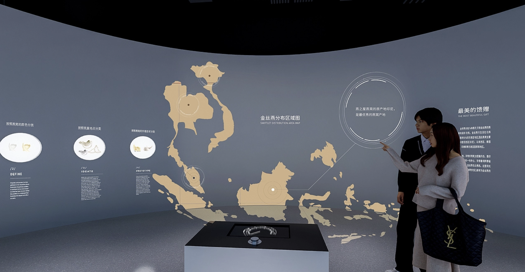 细节联动更能凸显设计巧思,兼顾专业性与观赏性。休息区用木质展示台搭配小型投影,木质的温润中和科技冷感,投影循环播放干细胞临床应用案例,让观众在放松中接收科普信息。成果区用金属展架陈列3D细胞模型,展架内置感应装置,观众靠近即可触发语音讲解与动态数据投影,金属的科技感与多媒体的信息传递功能相得益彰。
