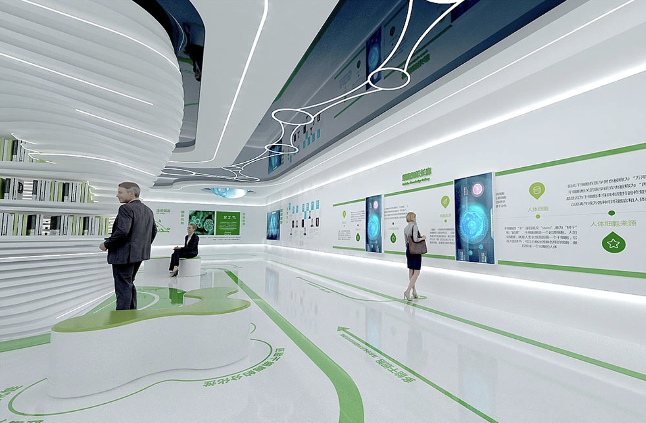 在实际设计中,还可以根据展示内容的特性和需求,结合使用暖色调和冷色调灯光。例如,在展示干细胞的基本知识和应用原理时,可以使用暖色调灯光来营造舒适的学习氛围;而在展示干细胞技术的最新进展和成果时,则可以切换至冷色调灯光,以突出其科技含量和创新性。